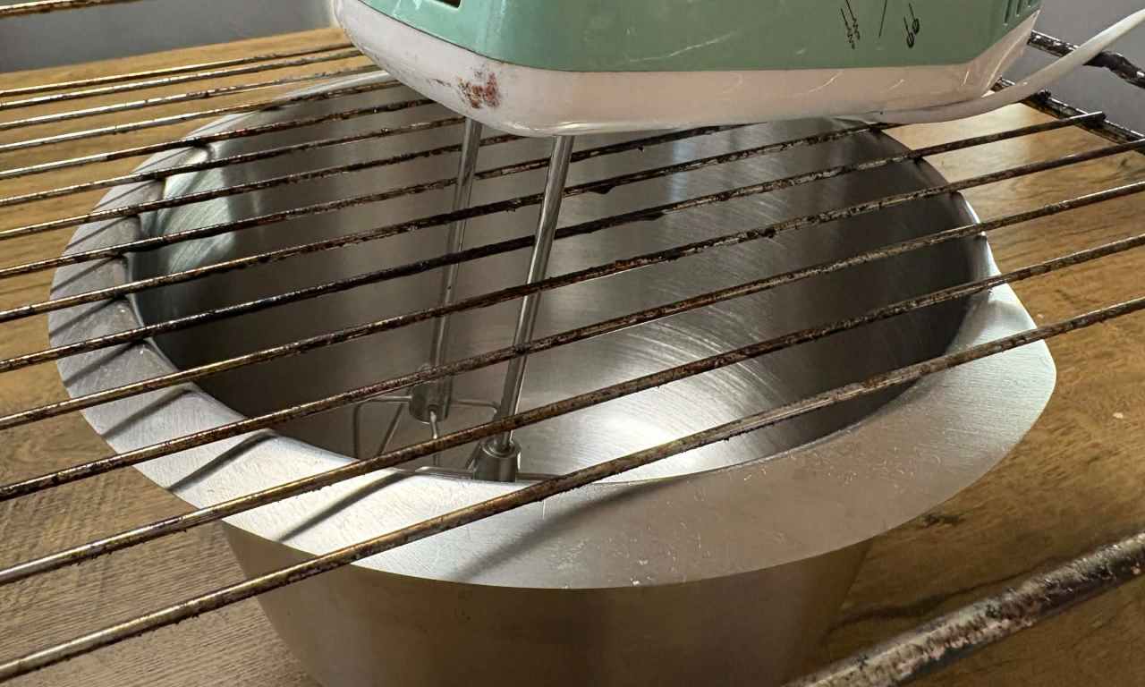 Riešenie je prekvapivo primitívne. Vezmeš rošt z rúry alebo kovovú mriežku, ktorú máš doma, položíš ju na misku a metly mixéra prestrčíš cez medzery. Samotný mixér necháš opretý o vrch roštu.