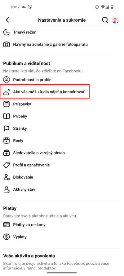 - Zroluj ponuku ku sekcii Publikum a viditeľnosť a klikni na Ako vás môžu ľudia nájsť a kontaktovať.