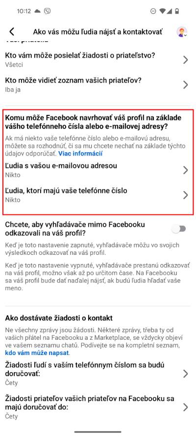 - Teraz zroluj k možnosti Komu môže Facebook navrhovať váš profil na základe telefónneho čísla alebo e‑mailovej adresy a funkciu deaktivuj.
