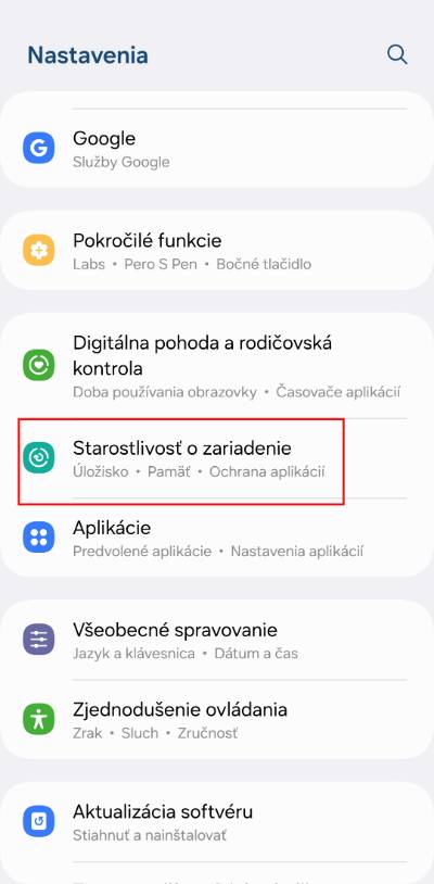 - Teraz zroluj ponuku k možnosti Starostlivosť o zariadenie.