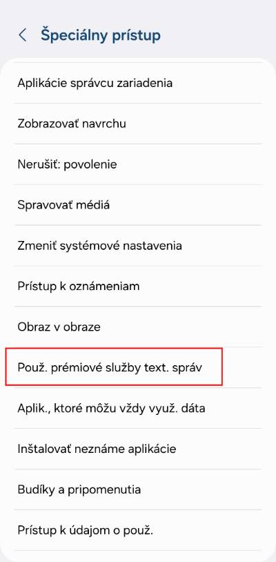 - V rámci týchto povolení nájdi možnosť Používanie služieb prémiových správ SMS. Keď otvoríš túto kartu, uvidíš aplikácie, ktoré ťa môžu prihlasovať k tomuto typu služieb.