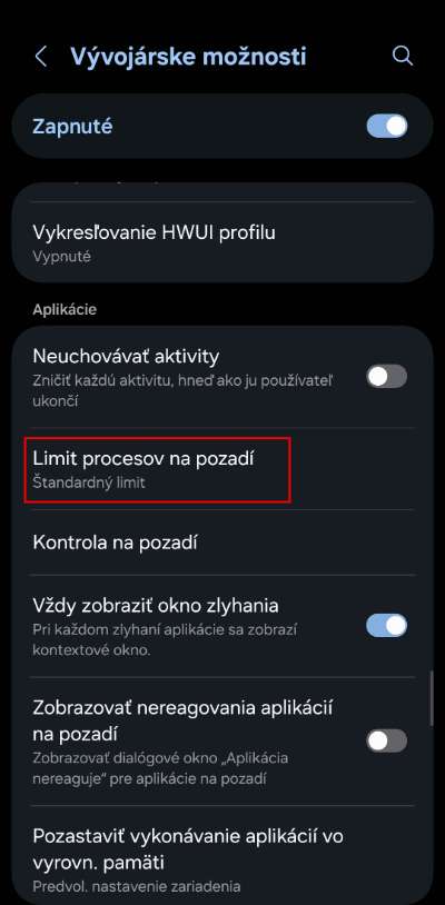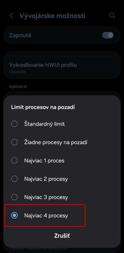 V nastaveniach pre vývojárov ešte chvíľu zostaneme. Oplatí sa totiž obmedziť počet aktívnych procesov na pozadí. Štandardne necháva Android bežať aj viac než 20 procesov, no ty ich môžeš znížiť, napríklad len na 4. Urobíš to jednoducho cez nastavenie limitov procesov, ktoré nájdeš práve v Režime pre vývojárov. Stačí si vyhľadať možnosť „Limit procesov na pozadí“ a zvoliť napríklad 4 procesy alebo dokonca „Žiadne procesy“, ak chceš ísť na maximum.