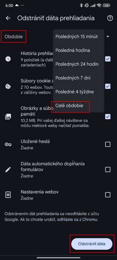 - Zvoľ si následne obdobie, za aké chceš odstrániť dáta prehliadania, ideálne za celé (pozn. ak by si nechcel odstrániť všetky dáta prehliadania, vrátane histórie, tak môžeš zvoliť len cookie súbory).