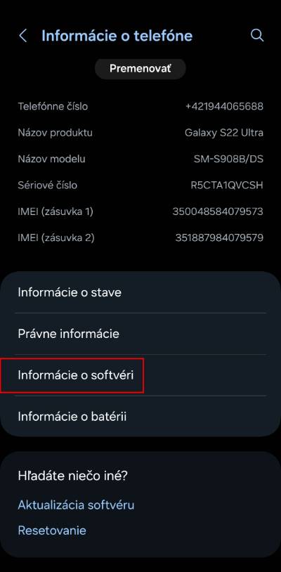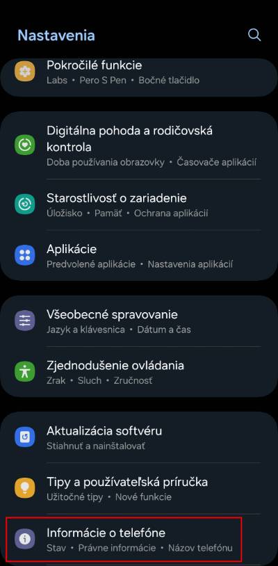 - Ponuku teraz zroluj k možnosti Informácie o telefóne a klikni na ňu.
