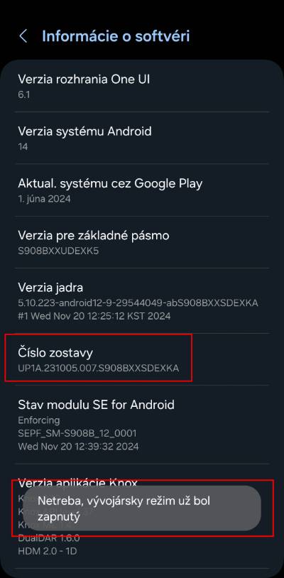 - Potom by si mal vidieť hlášku, že si odomkol Vývojárske nastavenia.