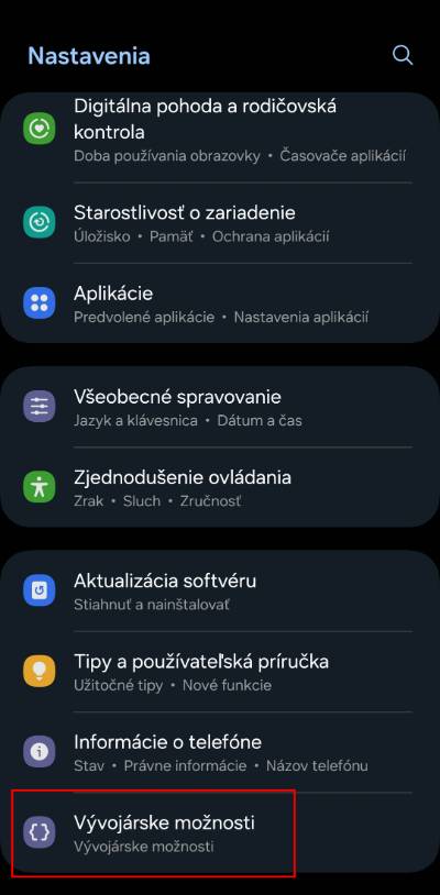 - Vráť sa na hlavnú kartu Nastavení telefónu a v spodnej časti uvidíš Vývojárske možnosti.