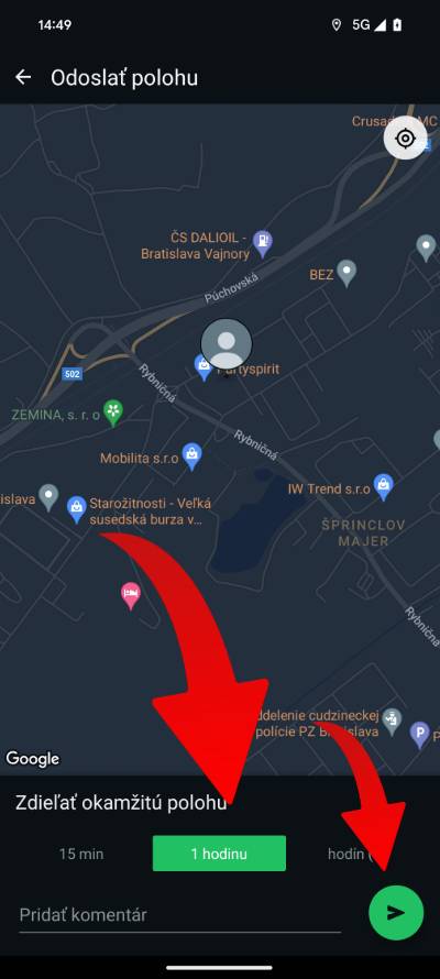 - Následne nastav, ako dlho chceš s kontaktom zdieľať polohu a odošli správu s tvojou polohou.
