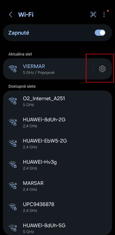 - Uisti sa, že si pripojený k sieti, ktorú chceš zdieľať, a klikni na ozubené koliesko.