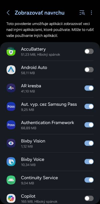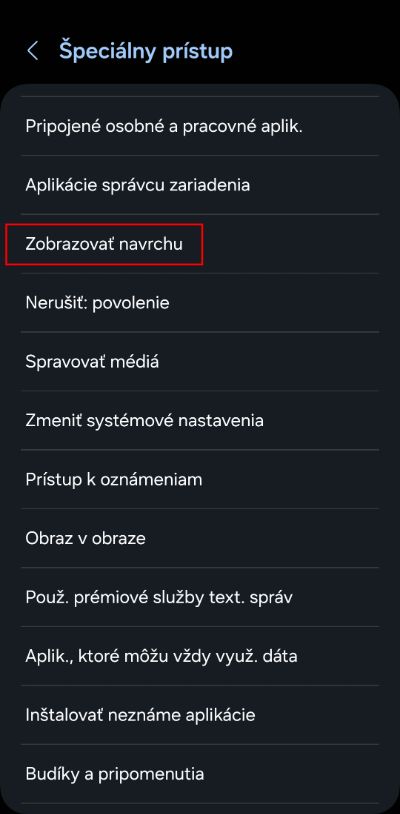 Ak máš telefón Samsung, vyhľadaj v Nastaveniach možnosť Aplikácie, klikni na ňu, potom na tri zvislé bodky v pravom hornom rohu a vyber možnosť Špeciálny prístup. V ponuke potom nájdeš aj možnosť Zobrazovať navrchu.